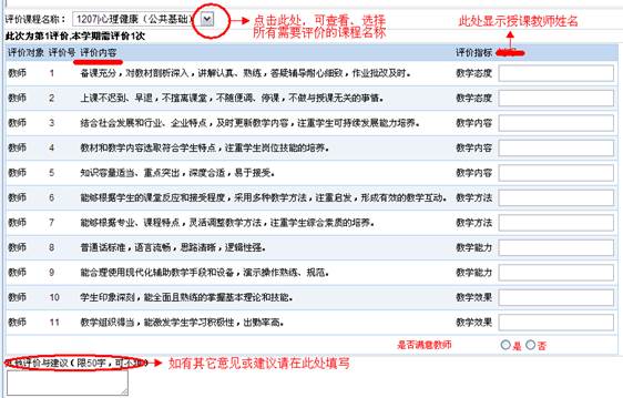 5.此时在“评价课程名称”处会自动出现要评价的第一门课程名称,点击右侧向下箭头如下图所示可以查看、选择要评价的所有课程,在“教师名称”处显示该课教师,在“评价内容”下显示了所有课程评价指标。如学生对该课教师有其他意见或建议,可在“其他评价与建议”栏内填写。
